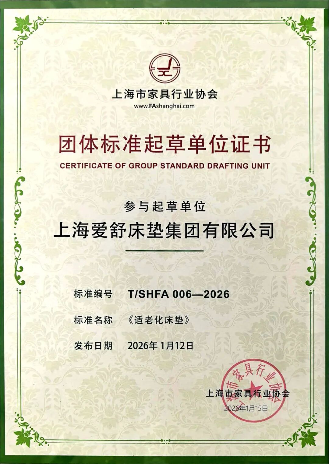 近日,爱舒床垫荣获《适老化床垫》团体标准起草单位称号,彰显了爱舒在适老化睡眠领域的领先地位和责任担当。该标准由上海市家具行业协会发布,于2026年1月15日正式实施。