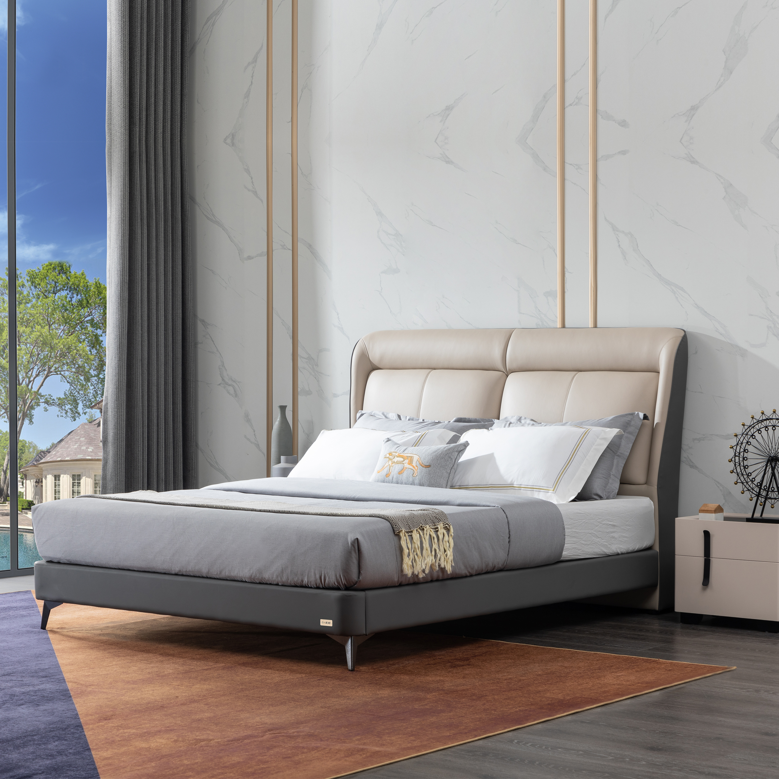 设计灵感来源于设计师在飞机头等舱享受的舒适体验。因此想把头等舱舒适的靠感融入到床架当中,床头采用饱满圆润的双靠包设计,完美贴合头颈和腰背部,两侧向内收的设计更具安全感。