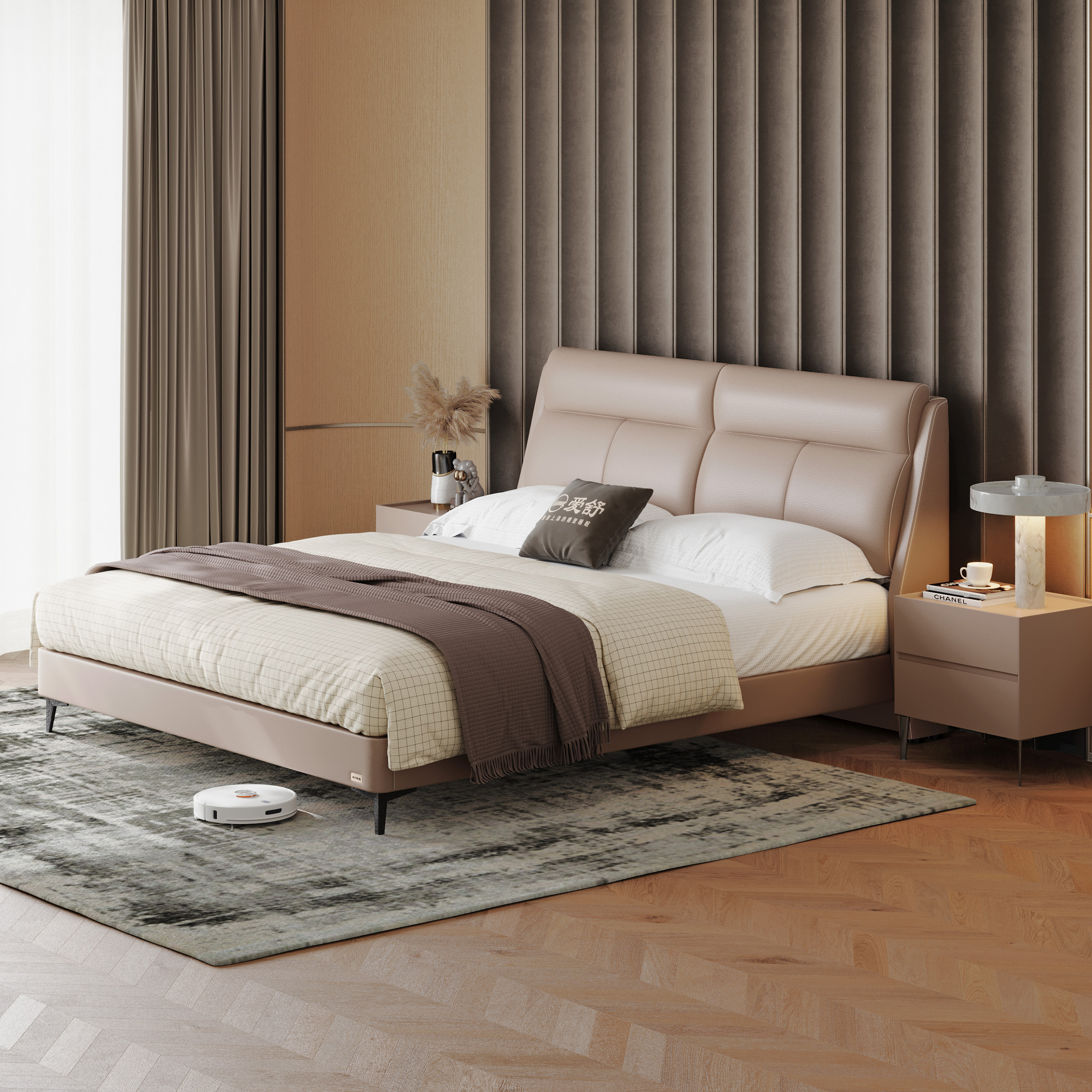 设计灵感来源于北京故宫,中轴线的对称之美是极致的中式美学,更是种精神追求。左右对称的大靠包,在视觉审美上给人稳定之感,寓意着家庭和谐、成双成对、幸福美满。