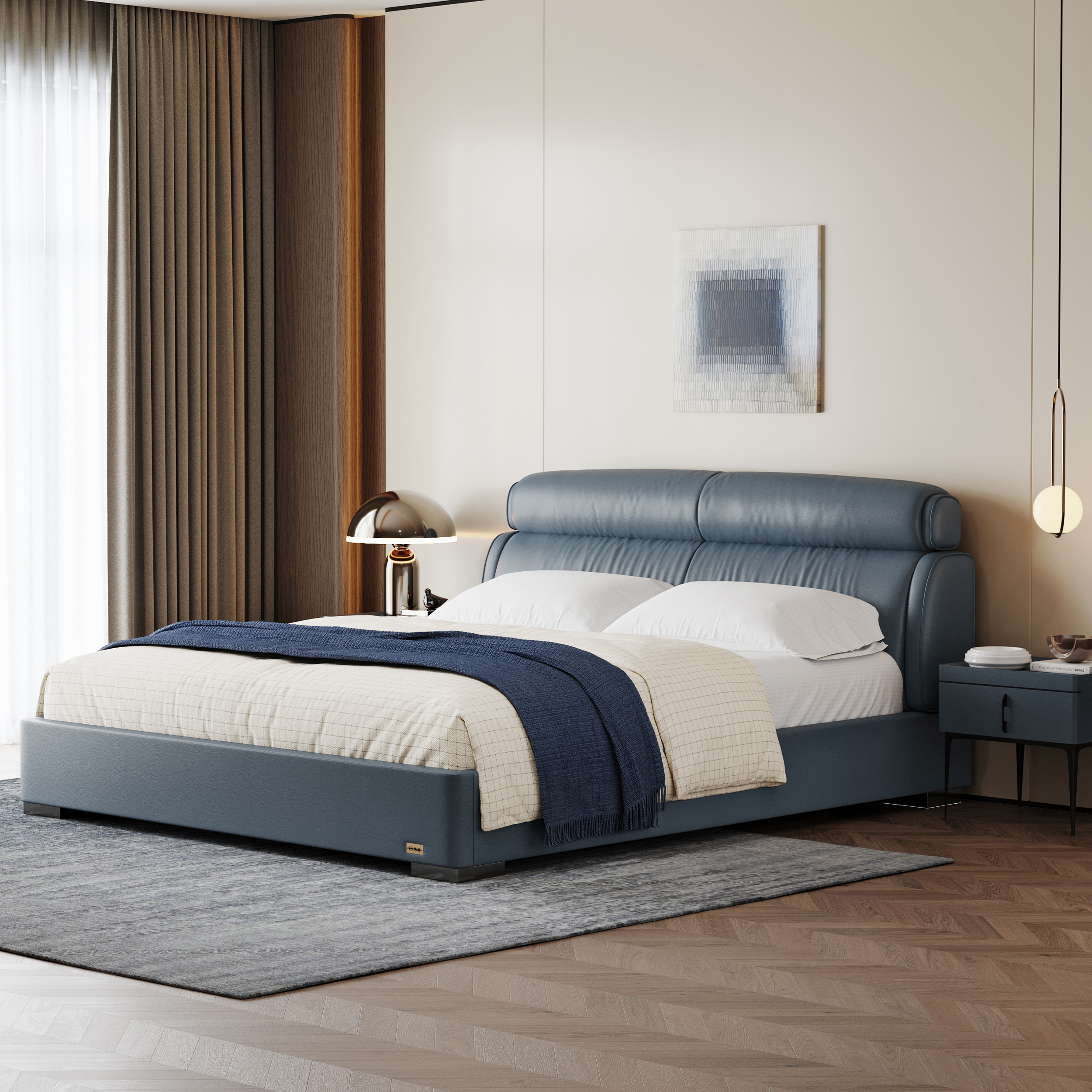 以巨型帆船为设计灵感,每一道线条都充满力量与美感。分段式床屏设计似张开的风帆,增添视觉层次感,打破了平直空间的沉闷,寓意着主人家一帆风顺、顺风顺水。床屏靠包按人体工程学黄金比例,科学分区承托,能够精准贴合人体曲线,托腰护背,让头颈自然放松。