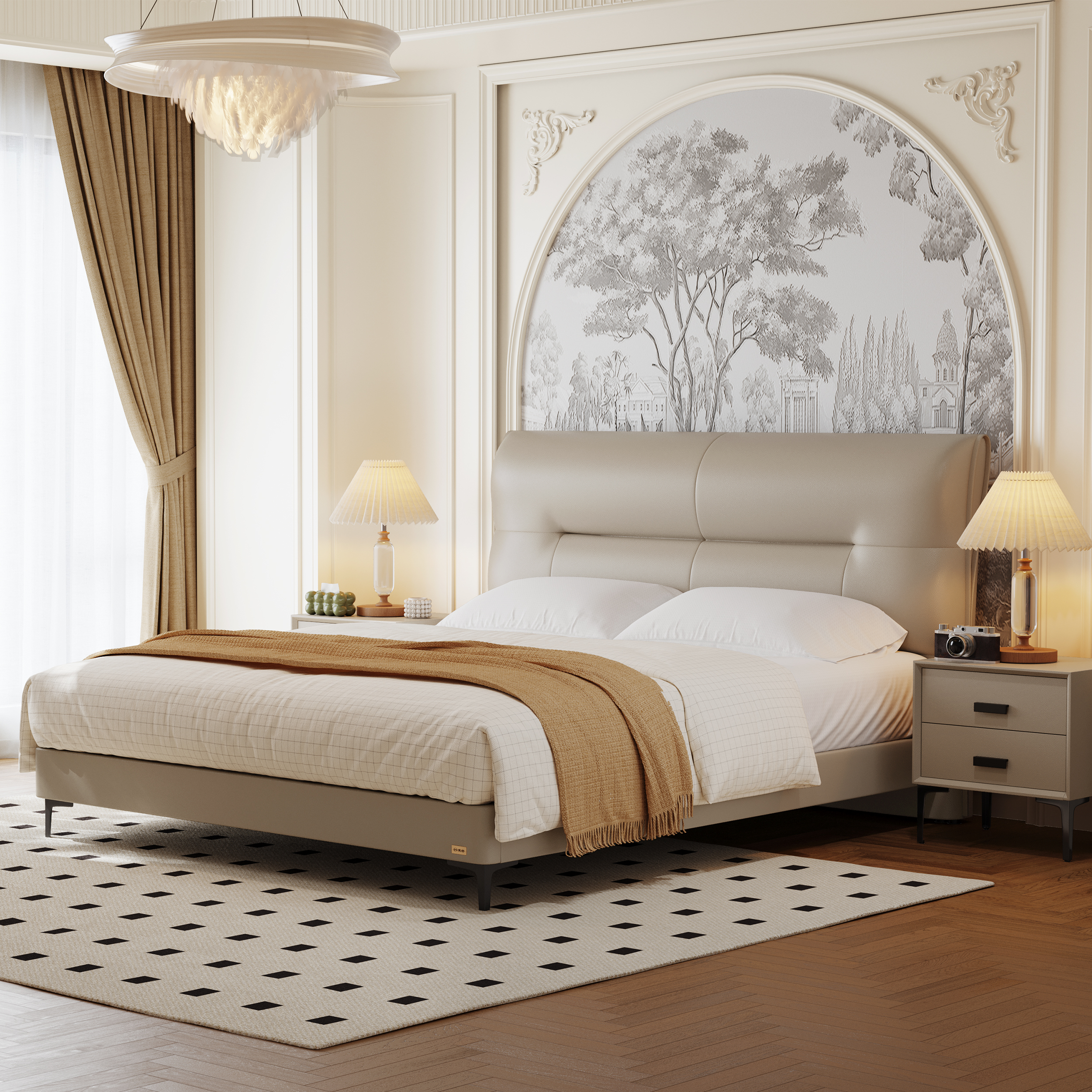 设计灵感便源自于泰晤士河的黄昏落日,泛着微微光泽的暖色系床屏,如同夕阳余晖,在华灯初上时静候主人双双归家,热情而温暖,床屏中间独特的一字拉线设计,寓意一心一意,只为你钟情。